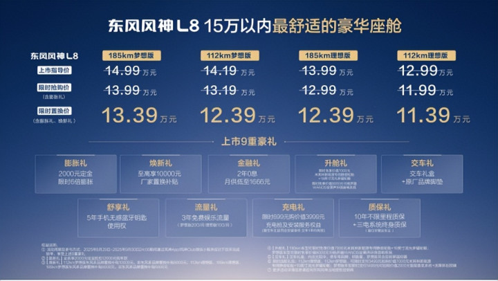 这次,东风风神L8的“放手一搏”,不仅赢得广大用户的信任,而且在行业中成功打响知名度。在它身上,用户充分体会到了什么才是真正的可靠,从乘坐舒适度到充沛动力,都很好满足全家人一同出行的用车需求,有它在无形中少了很多烦恼,尤其是在细节方面的人性化关怀很让人满意,伴随着上市时间增长,未来会有更多消费者发现它的优势,取得出色销量成绩也不是什么难事。为了在限时置换价11.39万元起的基础上“锦上添花”,官方直接推出9重豪礼,具体有膨胀礼、舒享礼、充电礼等,从买车到用车,照顾到每一个环节,减轻消费者购车负担,2025年9月30日24:00前下定就能享受这些上市权益,所以屏幕前的你还在等什么呢?